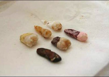 |  |  |  |  | A partire da sinistra, i denti rimasti immersi in: Tropicana orange juice, Nesquik, soluzione disincrostante, Gatorade fruit punch, the e Coca-Cola (foto: © Howard Swains/Cns). |  |